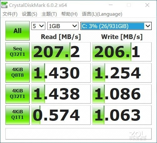 接下来使用 CrystalDiskMark 测试硬盘的读写能力,包括连续读写、4KBQ8T8 随机读写测试、队列深度(Queue Depth)为32的情况下的 4K 随机性能和 4KB 数据包随机读写性能。队列深度描述的是硬盘能够同时激活的较大 IO 值,队列深度越大,实际性能也会越高。可以看到 T40 配备的硬盘读取速度为 207.2MB/S,写入速度为 206.1MB/S,这个速度已经相当快了。