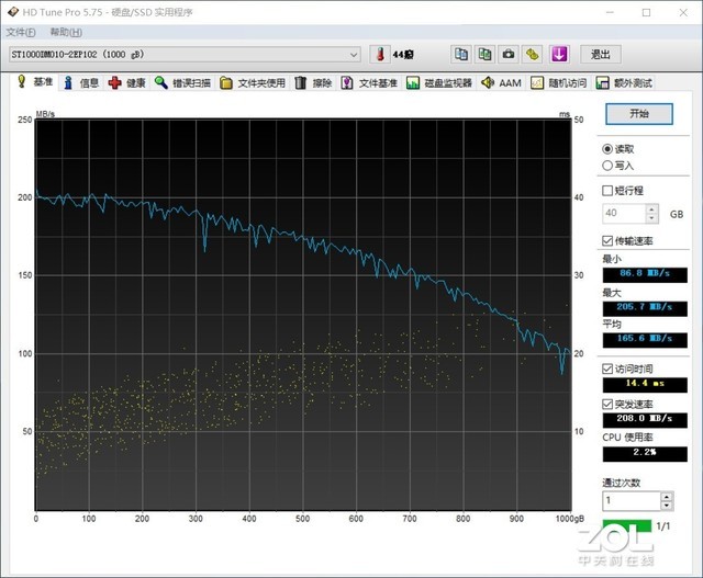 然后黄瓜网站视频再使用 HD Tune Pro 硬盘检测工具进行 1TB 读取速度测试,较低 86.8MB/S,较高 205.7MB/S,平均速度 165.6MB/S。