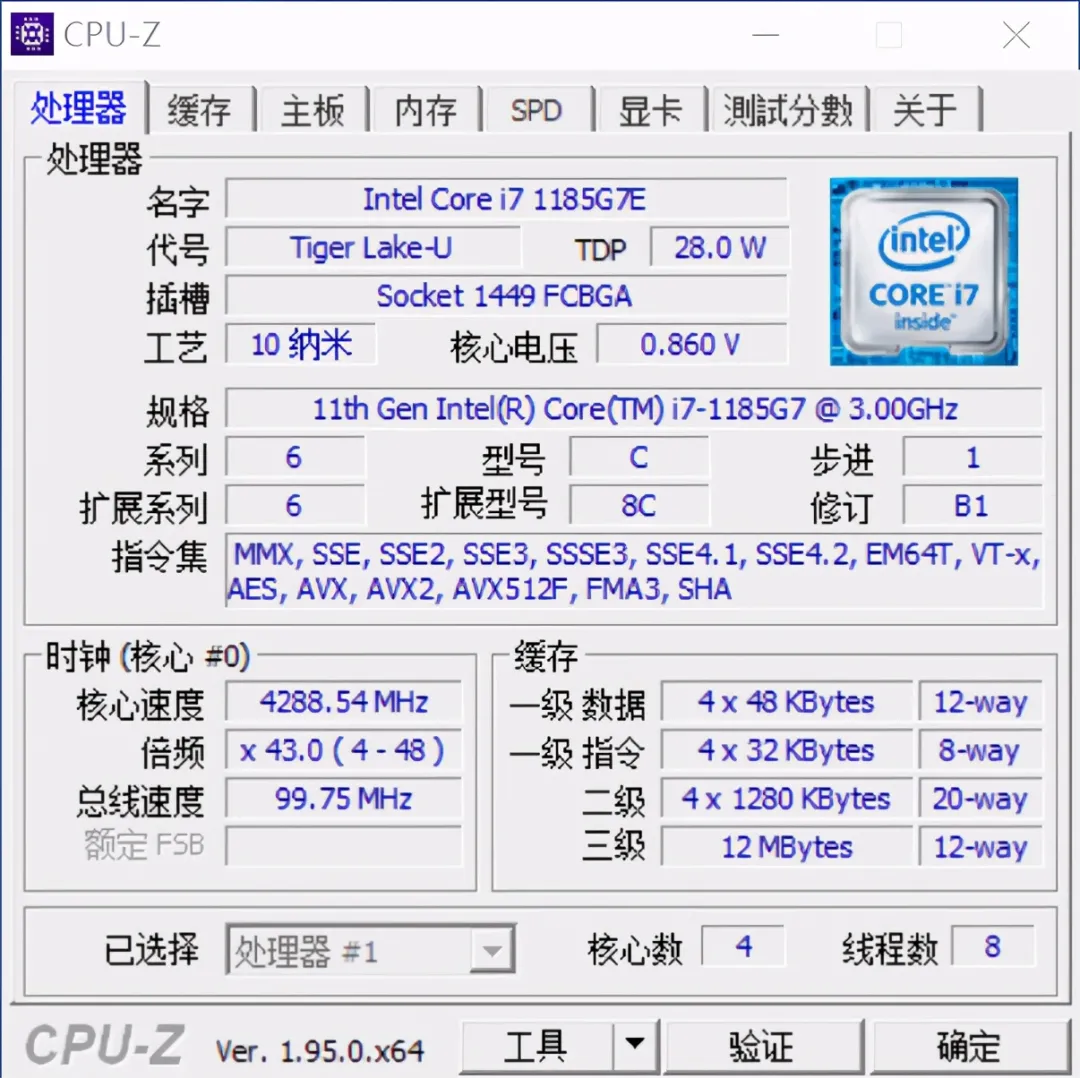 处理器:英特尔酷睿i7-1185G7(4核8线程,3.0GHz~4.8GHz)