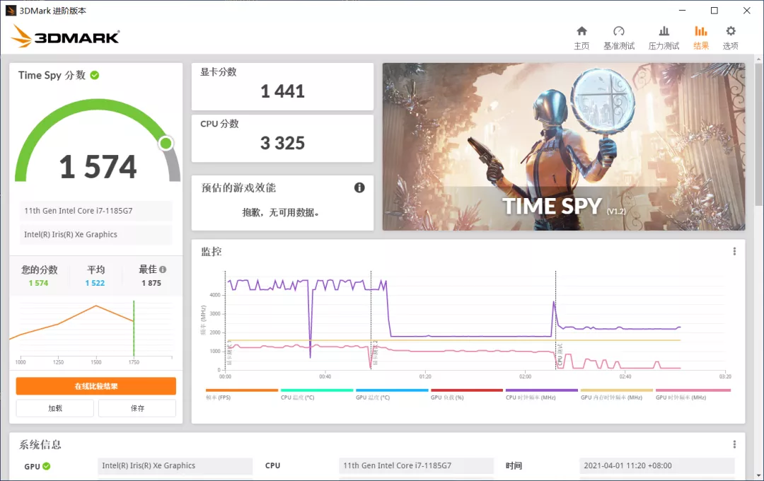此外,酷睿i7-1185G7处理器内置锐炬Xe显卡,锐炬Xe显卡的Boost频率可达1350MHz,拥有完整的96个EU执行单元。在3DMark Fire Strike中,这台机器得到4474的总分和5402的显卡分数,从显卡分数来看,该显卡的理论性能在MX350独显(图形分数大约4350左右)之上,不过和其他同配置的笔记本电脑相比有大概7%的差距。考虑到Latitude 7320二合一笔记本是一台小巧轻薄的商用本,这样的表现也可以理解。