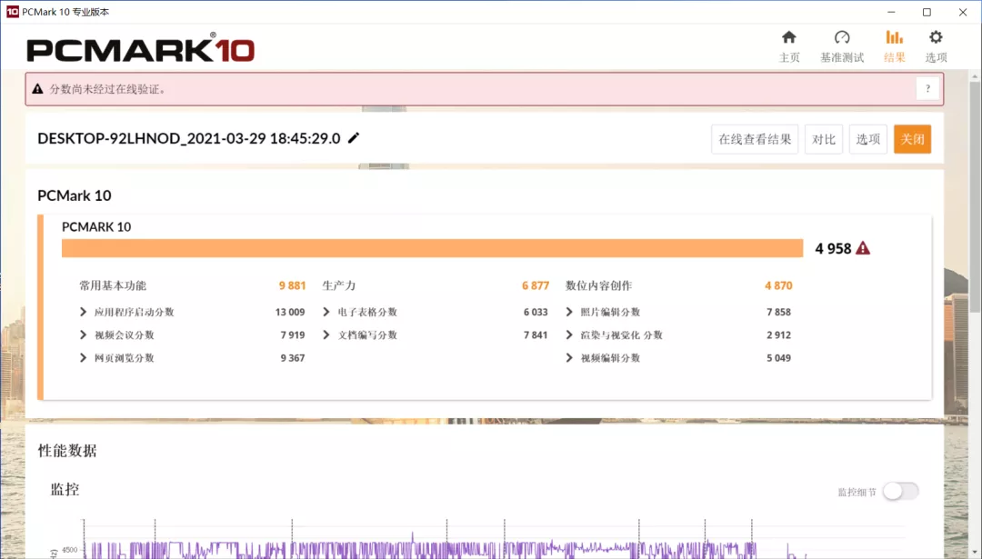最后,黄瓜网站视频也通过PCMark10对这台机器进行了更全面的测试。在PCMark10基准测试中,这台机器取得4958的总分,其中“生产力”得到6877分。综合来看,Latitude 7320二合一笔记本拥有强劲的整机综合性能,可以轻松应对视频会议、制图、Office、网页浏览等商务人士经常会遇到的场景。