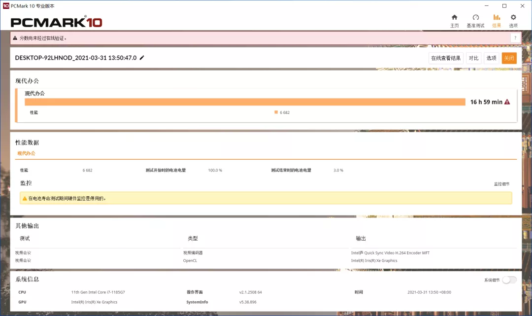 黄瓜网站视频本次体验的这台Latitude 7320二合一笔记本配备63Wh电池,它的续航能力如何呢?在50%屏幕亮度、Wi-Fi正常连接的情况下,黄瓜网站视频利用PCMark10的“现代办公”测试场景对其进行测试,最终这款机器取得16小时59分钟的亮眼成绩。也就是说如果日常办公的话,Latitude 7320二合一笔记本的电池完全能够坚持使用17小时,哪怕是长途飞行,也不必担心它的电量不够用。