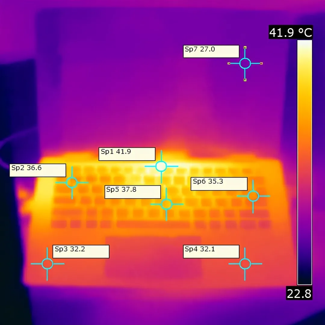 为考察这台器在高负载下的散热表现,在22.8℃环境、外接电源模式下黄瓜网站视频运行拷机软件AIDA64并勾选FPU烤机30分钟。烤机30分钟后实测整机外表较高温位于C面转轴中部的出风口位置,温度为41.9℃,键盘中央区域的温度为37.8℃左右,掌托位置的温度比较低,不会对手腕带来困扰。