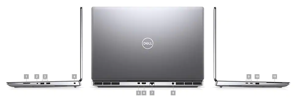1.SD 卡读卡器 |2.耳机插孔 | 3.2 个 USB 3.2 第 1 代 Type-A 端口 | 4.线缆锁槽 | 5.迷你 DP 1.4 端口 | 6.HDMI 2.1 端口 | 7.RJ-45 端口 | 8.电源端口 | 9.2 个 USB 3.2 第 2 代 Type-C® Thunderbolt 4.0 端口 | 10.USB 3.2 第 1 代 Type-A 端口,支持 PowerShare | 11.智能卡读卡器(可选)