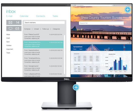 更多多任务处理方式:借助Dell Display Manager软件上的Easy Arrange功能,您可轻松跨多个窗口工作,还能从多个预先定义的模板中任意选择。您可快速平铺并排列应用程序,且自动恢复功能还可记忆上一次中断的地方,让您更快地重新开始工作。
